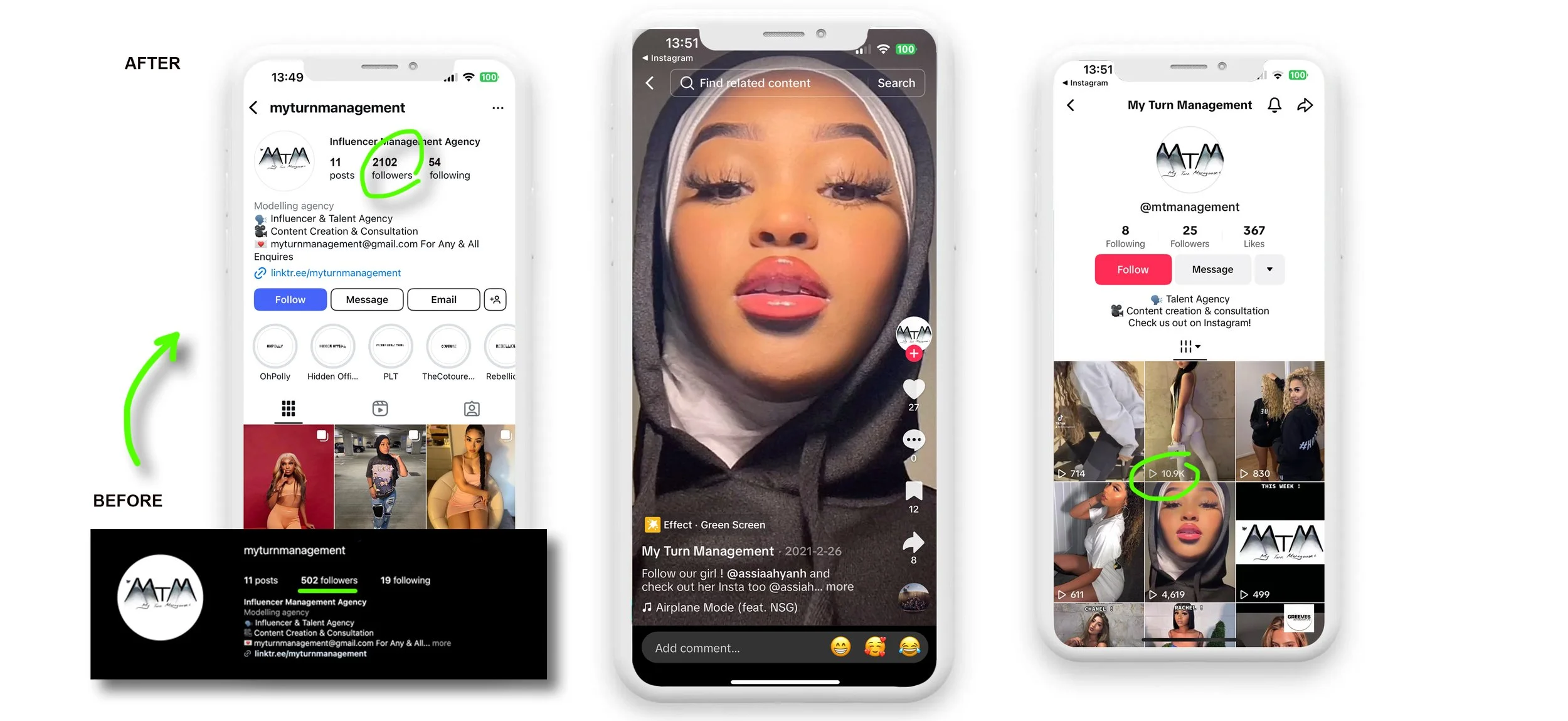 Redesign and optimise the Instagram page, create a unique social media strategy and campaign in order to increase awareness, traffic and engagement. We also needed to work on content strategy for each individual model in the My Turn Management (MTM) roster. Our goal was to help break into the Instagram and TikTok algorithm to secure new, high-level collaborations.